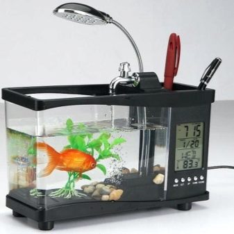 small USB aquarium with a goldfish - in addition to contemplating the movements of a graceful goldfish calming a person, the director will be able to take advantage of other opportunities of such a presentation - it has a watch, a stand for office supplies;