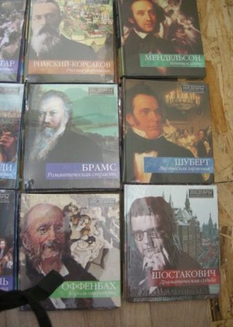 Music teacher - music notebooks, a set of discs with a collection of classical music, a bright illustrated encyclopedia with a description of the biography and creative path of world composers.