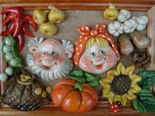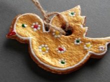 You can make an interesting craft out of salt dough. To prepare the mixture, it is enough to combine 200 g of flour and salt with 125 ml of water. For decoration, use dyes, stones, sparkles, small figures. If you make a gift with a small child, then the print of a small pen or leg will look quite original.