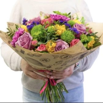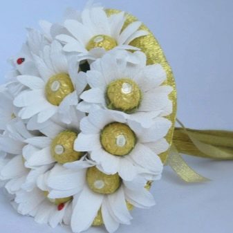 The original bouquet can be made from sweets. Simply wrap the sweets with corrugated paper and make stems from wire. The latter can be decorated with a green floral ribbon. Then collect and pack the bouquet in the same way as you would with fresh flowers. The gift is original and delicious.