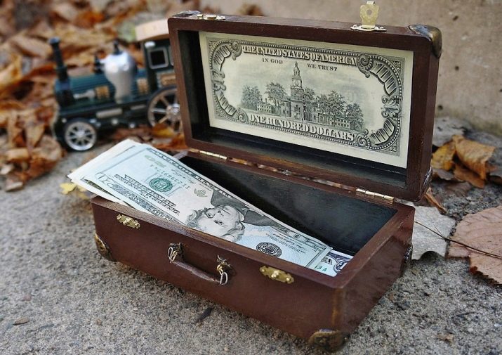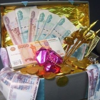 You will need a box or box, stylized as a chest of filibusters, in a vintage style. Next, you just need to put the bills there, interspersing them with simulated treasures: pebbles, rhinestones, jewelry, coins. You can complete the composition with a padlock.