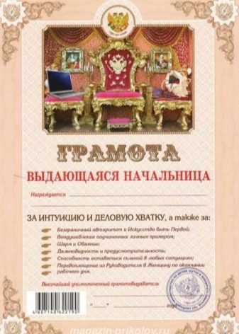 If your leader communicates with subordinates in a simple way, you can surprise her with your creativity. For example, you can do it yourself in a graphical editor playful diploma or give a certificate for 1 hour of overtime work of the whole team.