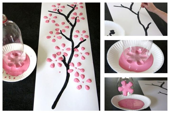 The next step will be the image of flowers. You can use such a life hack for this. An ordinary plastic bottle is taken, paint of the desired color is poured in the saucer. The bottom of the bottle is dipped in paint and applied to a leaf with a depicted branch. You do not need to hold the bottle for a long time, otherwise the paint will spread and you will just get a stain instead of a flower. You need to arrange the flowers sequentially, in a checkerboard pattern, but not too often.