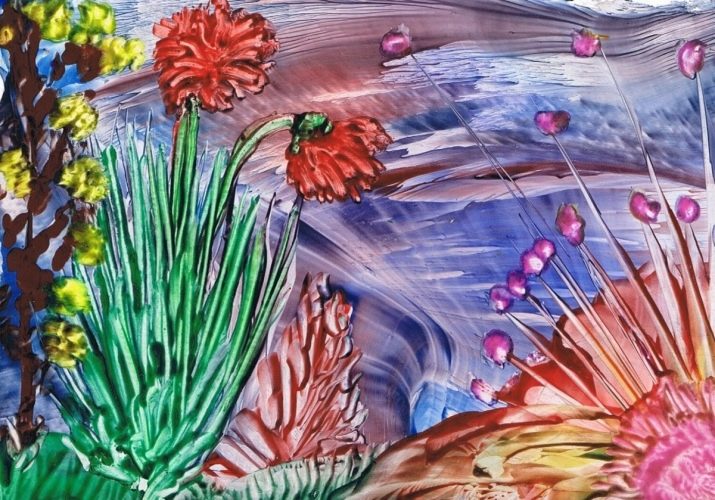 Then the sole of the iron is wiped, a new color is applied. The steps are the same as when working with the first color. Or you can depict the hills by moving the iron in waves. To draw greens, you need to attach the sole of the iron to the paper and sharply remove it. You can work out the grass in more detail with the help of the nozzle or edges of the device, simply by moving them over the non-hardened paint.