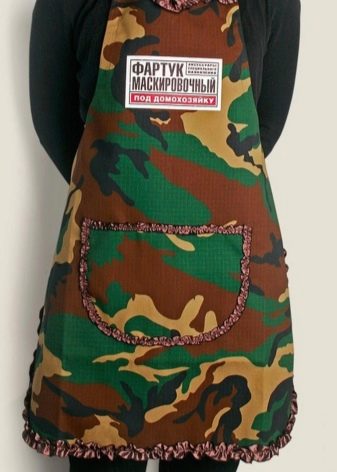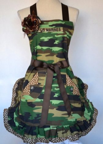 It is assumed a special version of kitchen clothes, for example, in camouflage colors. Along the edges of the apron are embroidered delicate flowers, the inscription “disguise as a housewife” is visible on the chest. Quite often, such a gift is presented to a girl from a friend. And if you can’t find a design with a suitable inscription, you will have to go to a specialized center and make custom embroidery.