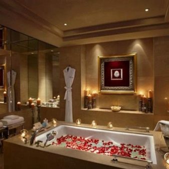 In this style, it is not forbidden to decorate the whole apartment. Especially appropriate romance in the bathroom. Petals in water, fragrant foam, candles, the smell of passion in hot air. It is not forbidden to drink a glass of cool champagne or wine. Strong drinks are not for the bathroom, it is better not to experiment with the pressure and reaction of the body to serious alcohol.