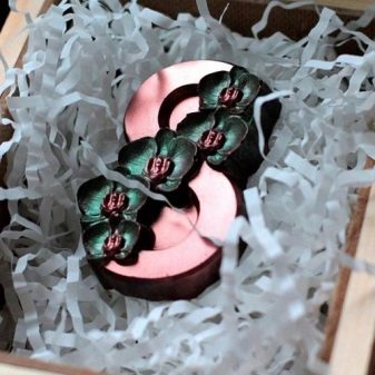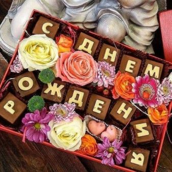 Handmade chocolate in itself is already a wonderful gift, and if you make a set of sweets made from such chocolate, then there will be no limit to the birthday's delight. Sweets in this set have different tastes and additives. If desired, you can collect a personal set with wishes from a certain amount of sweets. It can be “Love”, “Bunny”, “Happy Birthday”, “Thank you”, “Daughter”, “Mom”, “Husband”, “Dad”, “Sweet Life”, “Advice and Love” or just a name . The choice of inscription depends on the imagination of the donor.