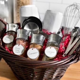 - For those who cannot imagine life without spices, a basket with all kinds of spices in beautiful jars and bags, as well as herbs, will be a good present.