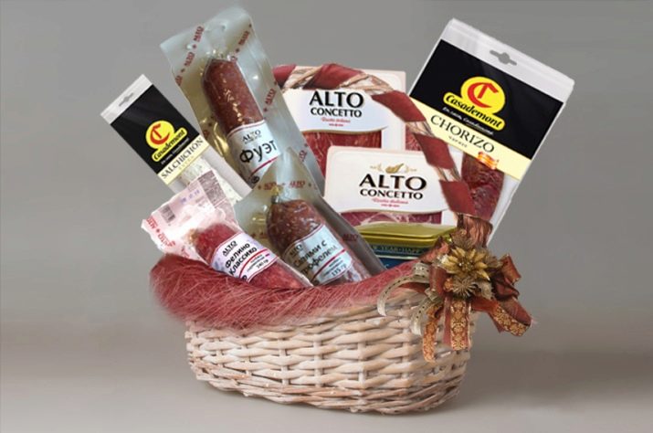 - If you intend to give a present to a man, you can fill the basket with meat delicacies, adding a bottle of good cognac and a couple of lemons. The basket may be sausage. Various types of smoked and uncooked smoked sausages can be supplemented with cheese products. The design of the basket with sausage can be supplemented with fresh herbs and vegetables.