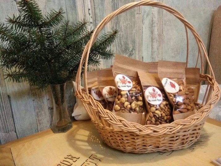 - No worse will be a basket with nuts and dried fruits. It can be filled by placing walnuts, hazelnuts, almonds, dried apricots, dates in different packages. A pair of jars of honey of different varieties will be a good addition to this option.