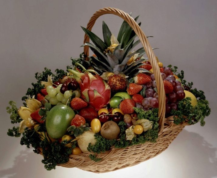 - A basket consisting only of fruits will delight everyone without exception. It is both tasty and healthy. Yes, and any fruit looks very beautiful together, albeit familiar, albeit exotic. Pineapples, pomegranates, mangoes, figs, grapefruits, melon, grapes - all this and much more will be a great addition to any holiday table.