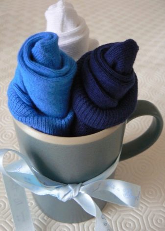 On certain holidays, many give each other socks. It can be original purchased socks or those that were hand-knitted. The gift is quite practical and useful. You can beautifully curl up this small gift and put it in a glass or mug with a funny inscription.