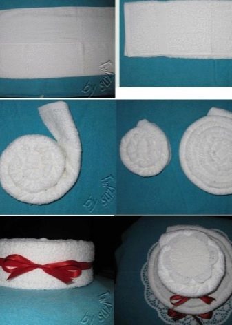 Towels are twisted into rolls and tied with thin ribbons or threads in color so that they do not open. Then make a circle from vertical rolls and tie a ribbon with a bow. So the lower tier will be ready. Similarly, make 2 more tiers.