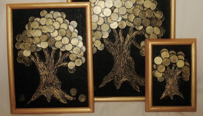 On the back wall of the frame, you need to make a dark background for the tree, on it gold coins will look most advantageous. It can be painted with dark paint, glued textured fabric. You also need to outline the contour of the future tree. Paint the twine itself with gold paint from a balloon. These will be the branches and trunk. The twine has an excellent texture, making the tree more believable. Then you need to cut the rope and stick to the background along the contour. Once the workpiece has dried, you can start gluing coins.