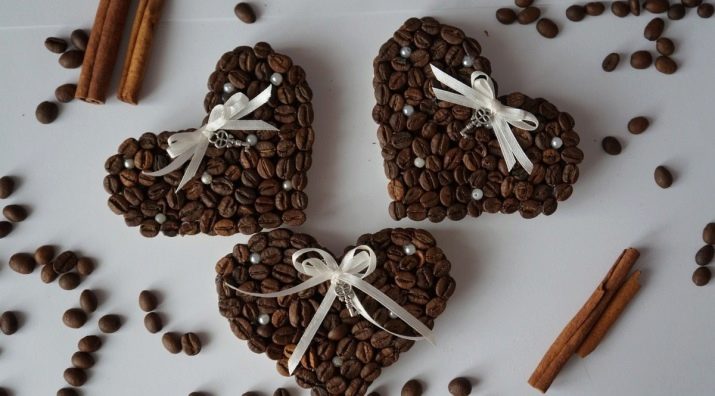 First, a shape, such as a heart, is cut out of cardboard. Then coffee beans are glued tightly to each other on cardboard. The direction of the grains determines the future pattern, so it is better to think in advance how best to attach. After the glue has dried, tie a bow from the tape and stick to the craft. To prevent the edges of the tape from opening, process with fire. Additionally, you can decorate with various beads and other elements. The last step is to stick the magnet to the back. He must support the weight of the craft. You can search for the magnet in hardware stores or use the old ones from the refrigerator.