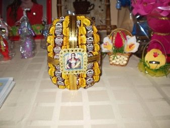 A sweet gift may consist of sweets repeating the shape of an Easter cake. Also from many sweets can be made an Easter egg wrapped in a festive paper package.