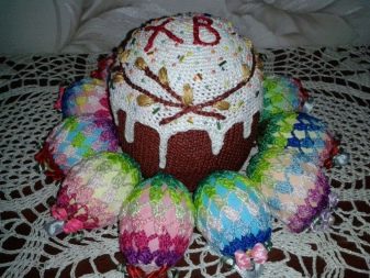 In addition to sewing, beautiful Easter gifts can be knitted or crocheted. Even with minimal experience with yarn, it will be possible to make a knitted Easter cake. To do this, you should knit a strip of yarn of your favorite color, fit a cut from a plastic bottle to it, or make a cardboard frame. Glazed top can be made of white fabric by cutting out a wavy edge, it is worth using multi-colored beads as decoration.