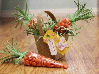 The theme gift for Easter will be orange "carrots", which will symbolize your favorite Easter rabbit food. Such sets are candies packed in polyethylene or marmalade in an orange wrapper in the form of a root crop, with green braid on one side.