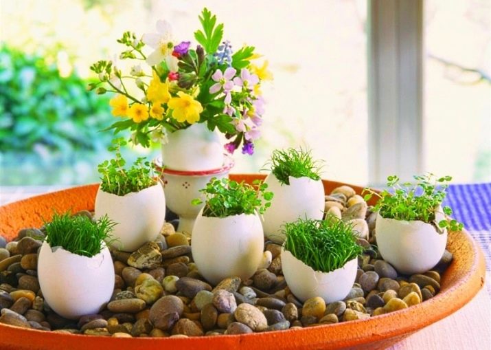 You can convey the Easter mood and celebrate the arrival of spring if you combine the two main attributes of these moments - eggs and flowers. From the shell you can create original "pots" in which you can place fresh flowers or make bouquets of paper. In this case, it is allowed to use colored or white eggs, collecting them together in a small basket. As the middle of flower buds, round candies can act.