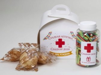 Similarly to this option, you can make a first-aid kit with drugs. Lollipops, chocolate coins, jelly candies are suitable as “medicines”. Small jars fill with sweets, beautifully decorate and make recommendations using. Such a first-aid kit is useful for raising the mood and vitality.