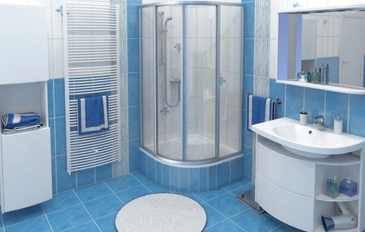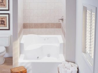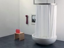 - Most of the products of this kind presented have a classic design. This makes it possible to concisely fit the cabin with high sides into any interior of the bathroom.