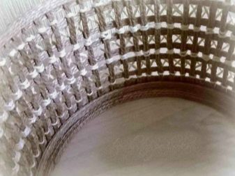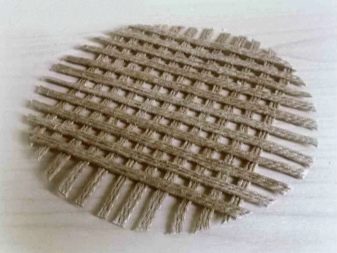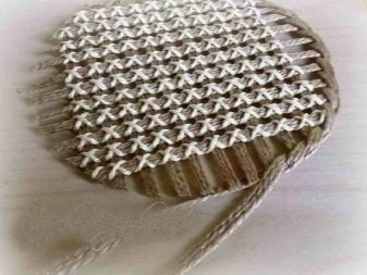 Next, from ribbons (ribbons made of threads), you need to draw a grid, as shown in the picture. Using elements of the same length, fill the entire lid. Next, the resulting mesh must be trimmed in a circle, giving the desired shape. Connect the two parts and get the base for the cover, which will look like this. Now you need to draw the grid using white jute. Choose a cross pattern.