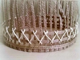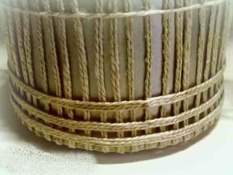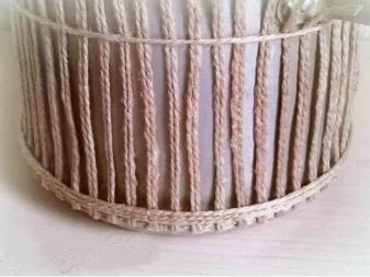 Now we decorate the upper edge, glue a tape of three jutes to it on top of the product. Top view of the finished edge. Now we need to make a cover. We make a circle of three threads, given the diameter of the box. After the inside of the elements, you need to glue a few more tapes, filling out 3 or 4 rows. To check the dimensions of the cover, place the product on it.