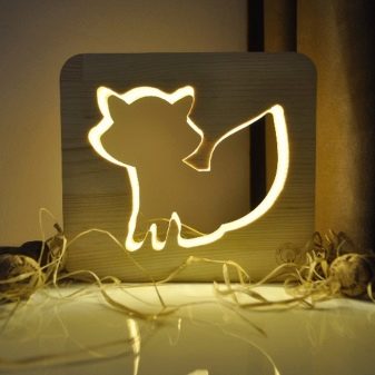 For the manufacture of children's night lights, you can prepare several small flat blanks of plywood in the form of squares or rectangles of the same size. In each such detail, drawings in the form of animals or in the form of a floral ornament are cut out. Through the holes made, light will enter the room.