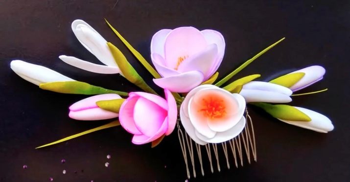- Foamiran flowers are often used to complement all kinds of jewelry and accessories.. So, charming crocuses, distinguished by discreet and pleasant colors of buds, can be an excellent addition to a small comb for hairstyles. The product will look even more interesting if it is decorated with long green petals and crocus buds that imitate the very beginning of flowering.
