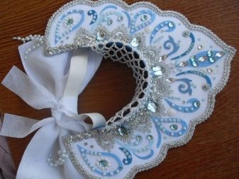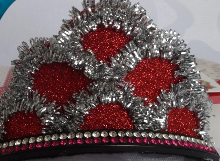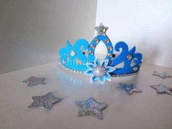 - A glamorous Snow Maiden diadem is made of blue glitter foamiran. It can be decorated with silver and light blue pebbles, fluffy snow-white inserts that simulate fur. It is advisable to give the accessory an unusual shape with complex pointed details.