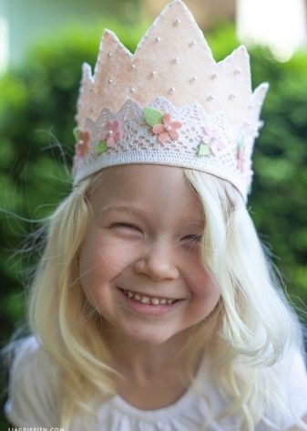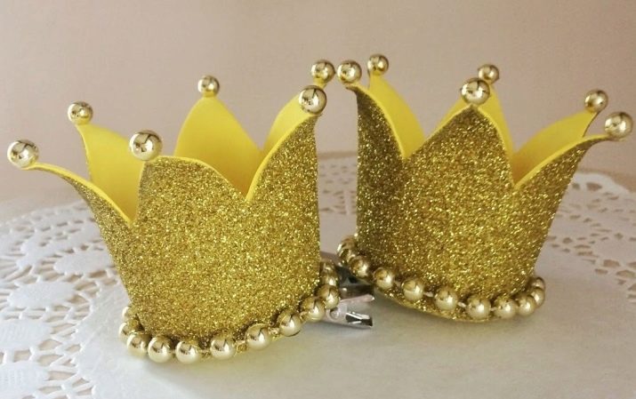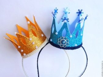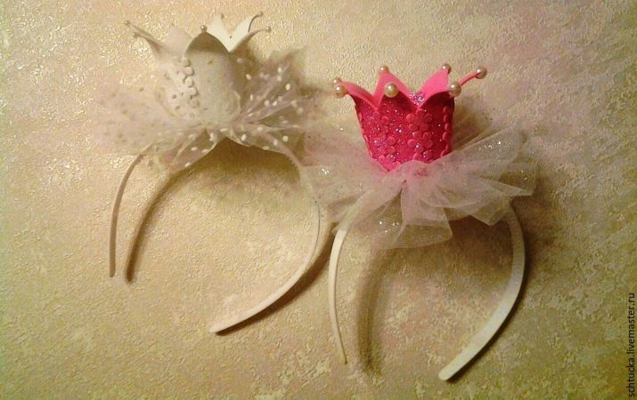 - Miniature foamiran crowns with slightly curved cloves complemented by beads look very cute on thin rims. The lower part can be decorated with bright wide skirts. The crowns themselves can have any color, for example, white or pink.