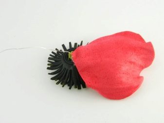 - The next step is to collect the flower. Attach the miniature petals first. The adhesive should be applied to the tip of this element. Then it will need to be carefully applied, grabbing the tip of the fringe and the head of the future home-made poppy.
