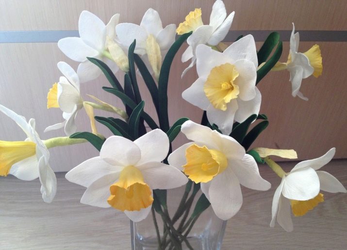 Floral arrangements can be used not only as an interior decoration, but also become part of the image. Foamiran is an elastic material that is easy to cut and shape. Any product can be made from it, if you follow the instructions. As for the flowers from foamiran, why not make a daffodil that looks elegant and beautiful.