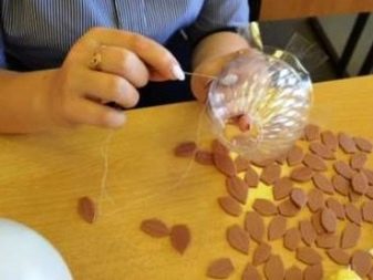 - Start sticking feathers in rows in a checkerboard pattern - from the bottom and make a full circle. In order for the foamiran pieces to fit snugly to the base, after the end of the circle, lightly heat them with an ordinary hairdryer at the base and press by hand. Repeat this operation after each lap.