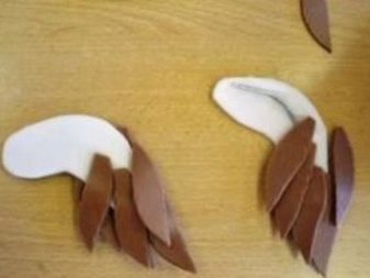 - For owl ears, cut two pieces of foamiran 8x3 cm in size and give them an hourglass shape, leaving about 1-1.5 cm of material in the middle. Bend the resulting figure slightly across so that it is more stable, and glue it to the crown of the owl, covering the place of attachment with feathers.