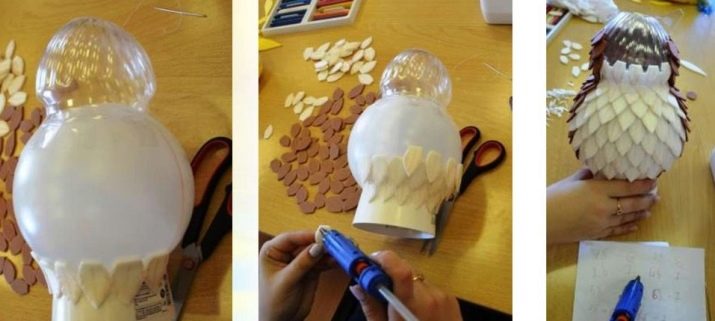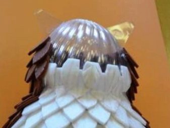 - Making the owl itself should start with the head. From the two bottles of 1.5 liters, cut off the upper parts. Cut them along and sew with threads or glue them with hot glue so that the head of the owl is extended in breadth without a tubercle on the crown.
