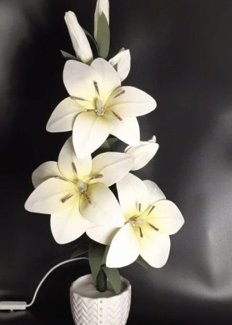 - In the interiors, where dark tones predominate, a classy table lamp, realized in the form of snow-white lilies with a yellow center, will find its place. Artificial flowers can be placed in a white compact pot with a raised surface. The original product will look good on the bedside table.