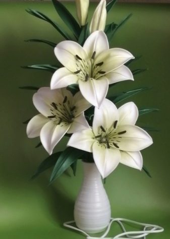 Particularly spectacular and attractive look artificial lilies, which are in a beautiful pot, in harmony with the surrounding interior. Many craftsmen prefer to make just such flowers. Moreover it can be large growth specimens, and not just small flowers on the windowsill.