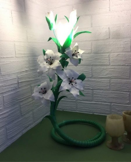 - Growth isolon lilies of a snow-white hue with a built-in lamp will look attractive against the background of a wall decorated with milk brick. To make the craft stand out more and draw attention to itself, it should be placed on a high saturated green stem with the same colorful leaves. Black stamens will gently dilute the surrounding white.