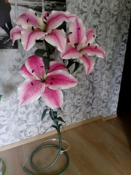 - If you want to bring variegated and “sweet” colors into the atmosphere, you can make a tall green stem with 3 large buds that have rich pink centers and snow-white edges.The product can play the role of a simple decor or an additional floor lamp. It can be placed near a free wall, finished with materials with a predominance of gray and white shades.