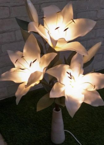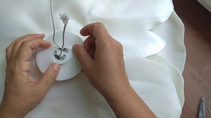 To get a working floor lamp, you must connect the lamp to the mains. To do this, the cable is processed, its ends are stripped to connect them to the plug. If you plan to use a switch, the wire is drawn through it. Then it remains to screw a bulb into the cartridge and check your lamp. In some cases, ice strips are used, which are attached to the inner surfaces of the flowers, this is suitable for nightlights.