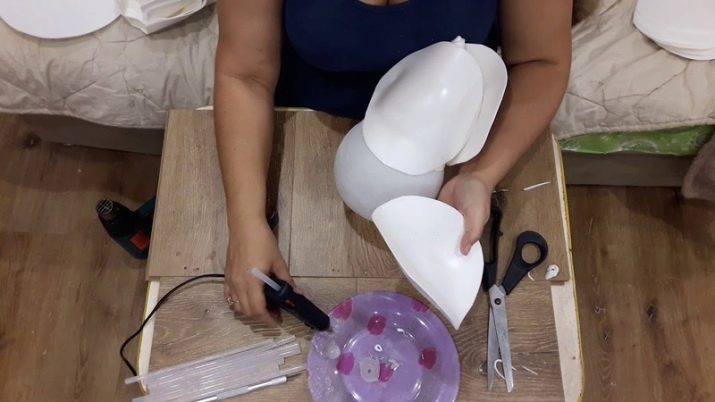 After the elements are prepared, you can collect the bud for the floor lamp. The petals are alternately and staggered to adhere to the coupling. In the first row are the smallest elements, then more and more. To ensure a long service life of flowers, it is recommended to use not only glue, but also fasten the petals to each other using a stapler or stitch them in inconspicuous places. The thinner the isolon, the more petals for the bud will be needed to make the bud look lush.