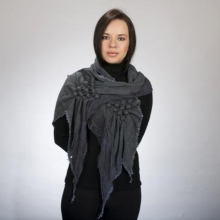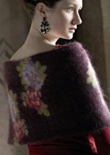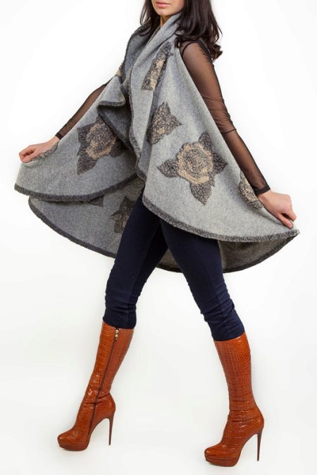 - The poncho of gray color from dense mohair material looks rather interesting and unusual. The product is decorated with a border for a couple of darker tones, as well as large flowers. The combination with jeans, a translucent turtleneck and mustard boots with high heels will look fresh and diversify the everyday wardrobe.