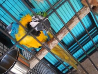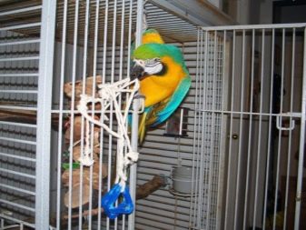 Keep in mind that the macaw loves to hang upside down, so place toys and vertical structures should be higher so that the bird does not hit the bottom of the aviary. Do not forget that these parrots are big lovers of water procedures, so in the cage you should definitely equip a small bath.
