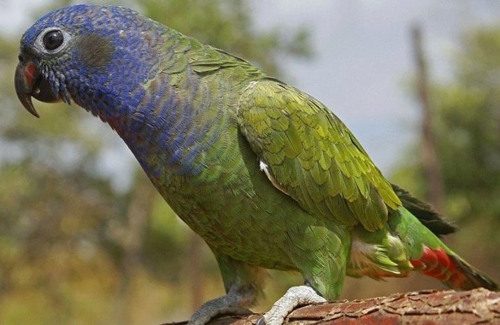- Blue-necked. A parrot with an iris of a light yellow hue, the cheeks are rather small, almost naked, covered with very thin feathers of blue color. The beak is very large, black. The legs are dark gray, the tail is elongated, at the end there is a pronounced narrowing. Feathers on the forehead in a deep blue hue. The same color is present in the plumage of the neck and throat of a bird.