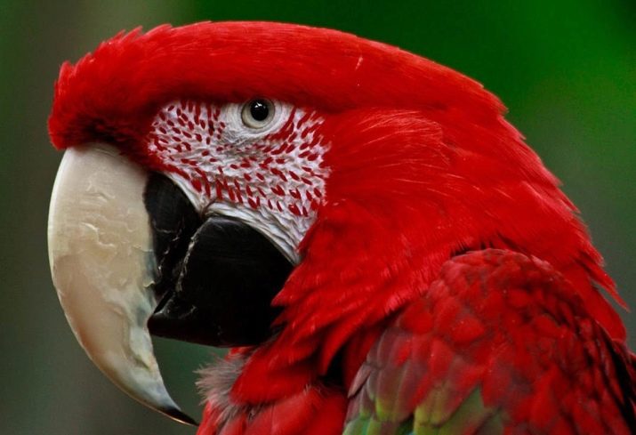 - Green-winged. Bird with a large wide head, beak is very large, powerful, black. The iris is light yellow, the area of the beak is soft pink, the mandible is dark. Cheeks have a rare plumage with burgundy thin feathers. Paws are gray.