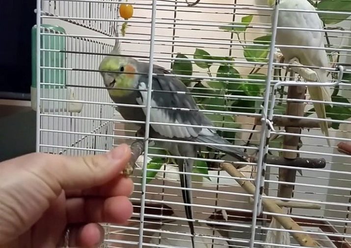 A parrot may not immediately respond to your offer, but if you do this periodically, the nymph will begin to approach and carefully take a piece of the treat. Continue to fix this result every day and when you achieve that when you see a piece between the rods, the bird joyfully fits and takes it, you can be sure that the skill is fixed.