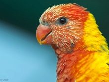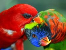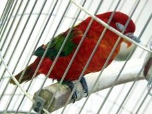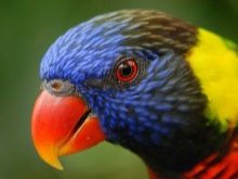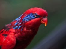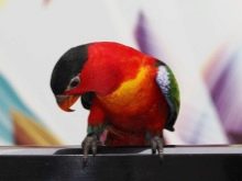 Red lory plus to the main color (red) it also has blue and black shades. Any species of Lori parrots is distinguished by a weak beak, their food is mostly soft and juicy, but not hard.