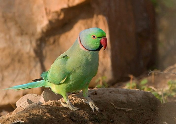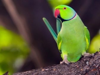 - Indian Ringed (Psittacula krameri). It lives in parts of Africa and South Asia. It is considered the largest population among parrots. Prefers to settle in the immediate vicinity of a person. The main color of the bird is green, under the color of foliage, with a blue tint, there are several black feathers on the wings, a head with a bluish tint, a narrow black stripe from the beak to the forehead, two strips on the neck - black and bright pink, the breast part of the male is black , the female has green.