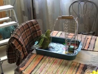 When the parrot gets used to this custom, you can put a container of water in the aviary so that it splashes on its own there. If there is no rejection, put the cage with the parrot in the bath and water it from above from the shower. Some owners teach the bird to bathe right in the bathroom without a cage.